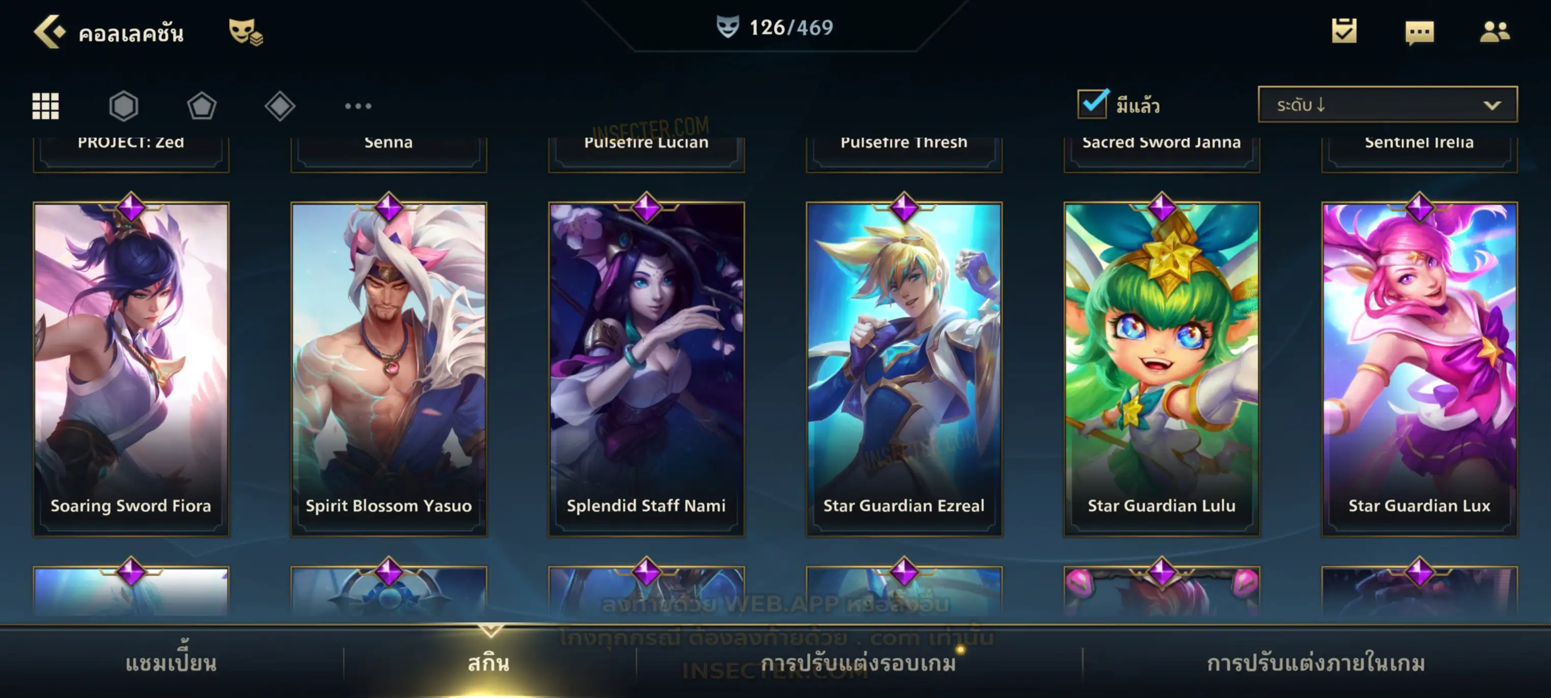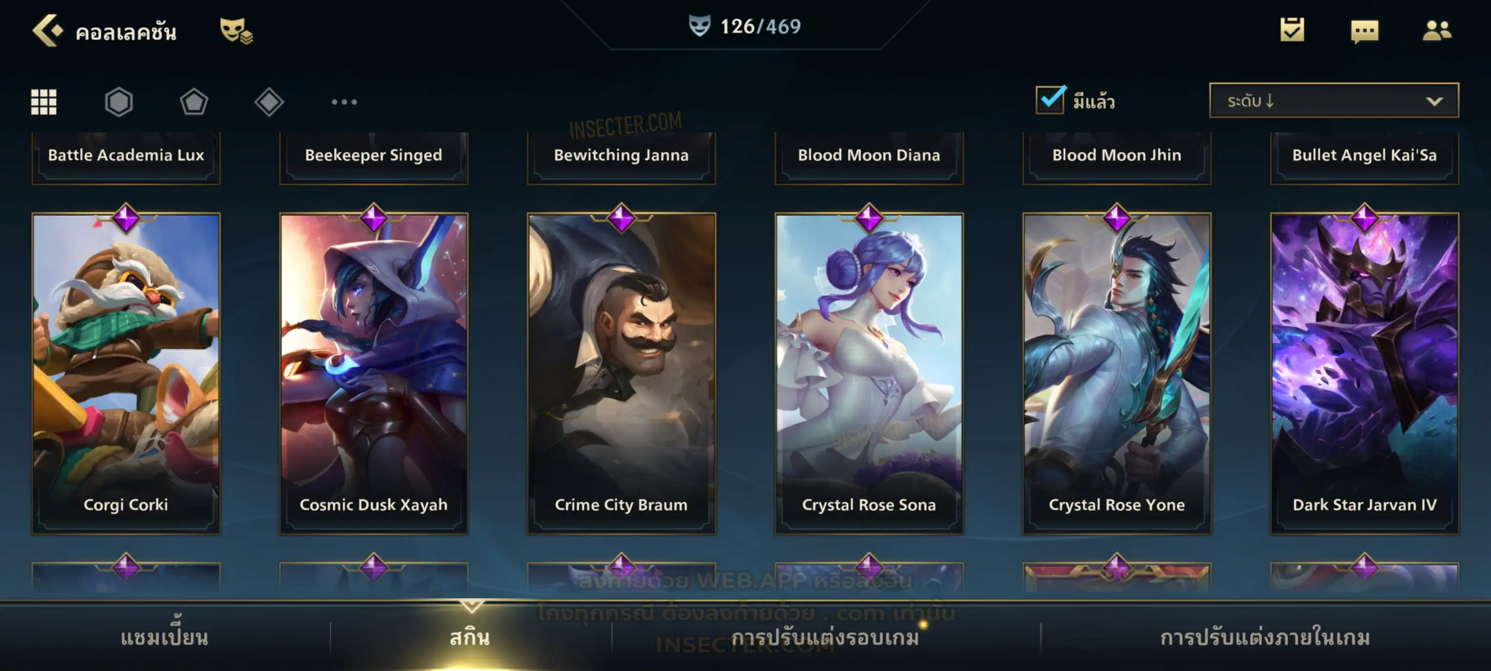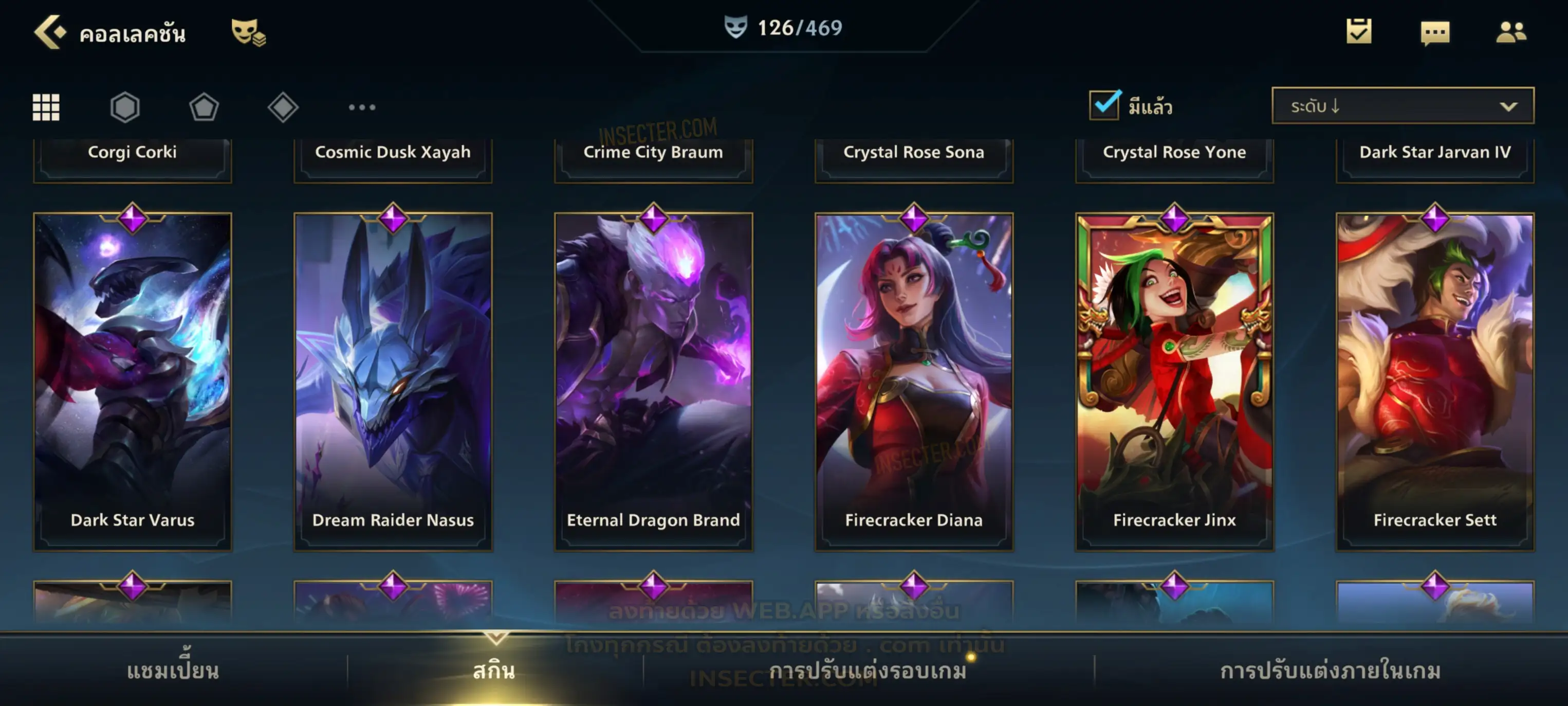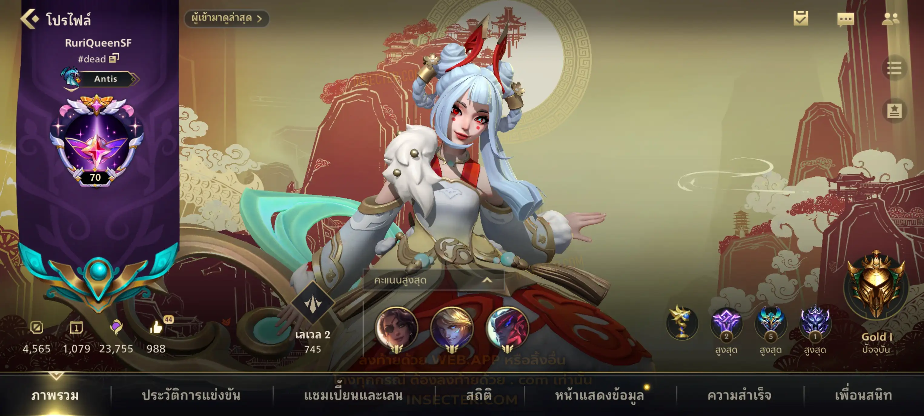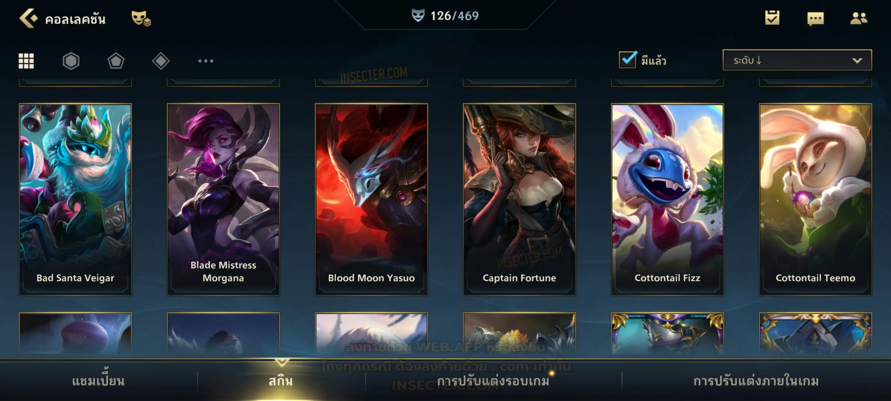 ข้อมูลย่อ : เมน MID-AD-TOP แชมครบของตกแต่งเยอะมีลิมิเต็ด 5 สกินคุ้ม ๆ จ้า ราคา 2,700 บาท 106/106 >แชมเปี้ยน 126 >สกิน 20 >Legendary (กรอบลิมิเต็ด 3 กรอบ) 69 >Epic (กรอบลิมิเต็ด 3 กรอบ+ท่าโพสพิเศษ 3 ท่า) 37 >อื่นๆ (กรอบลิมิเต็ด 6 กรอบ + ท่าโพสพิเศษ 2 ท่า)