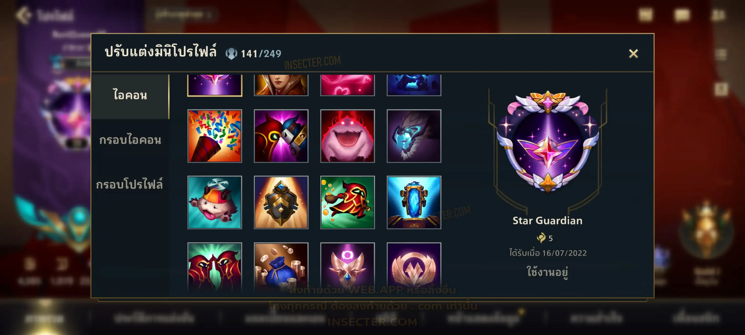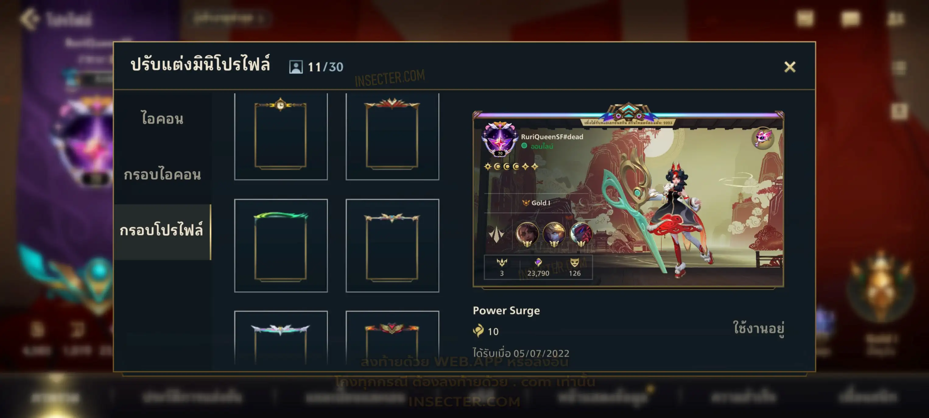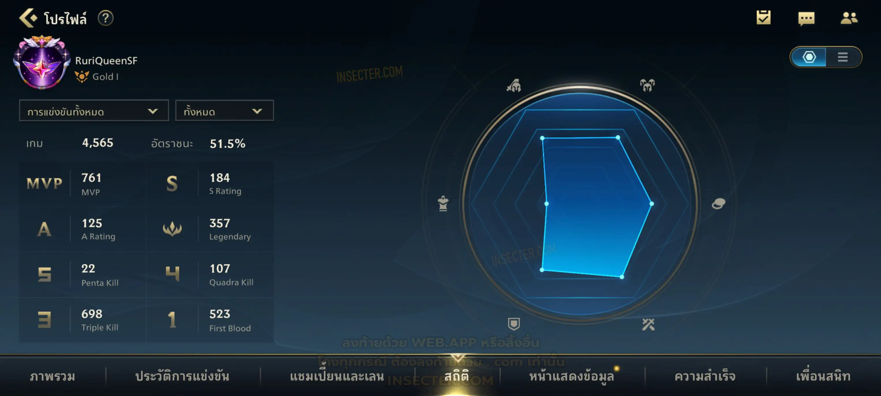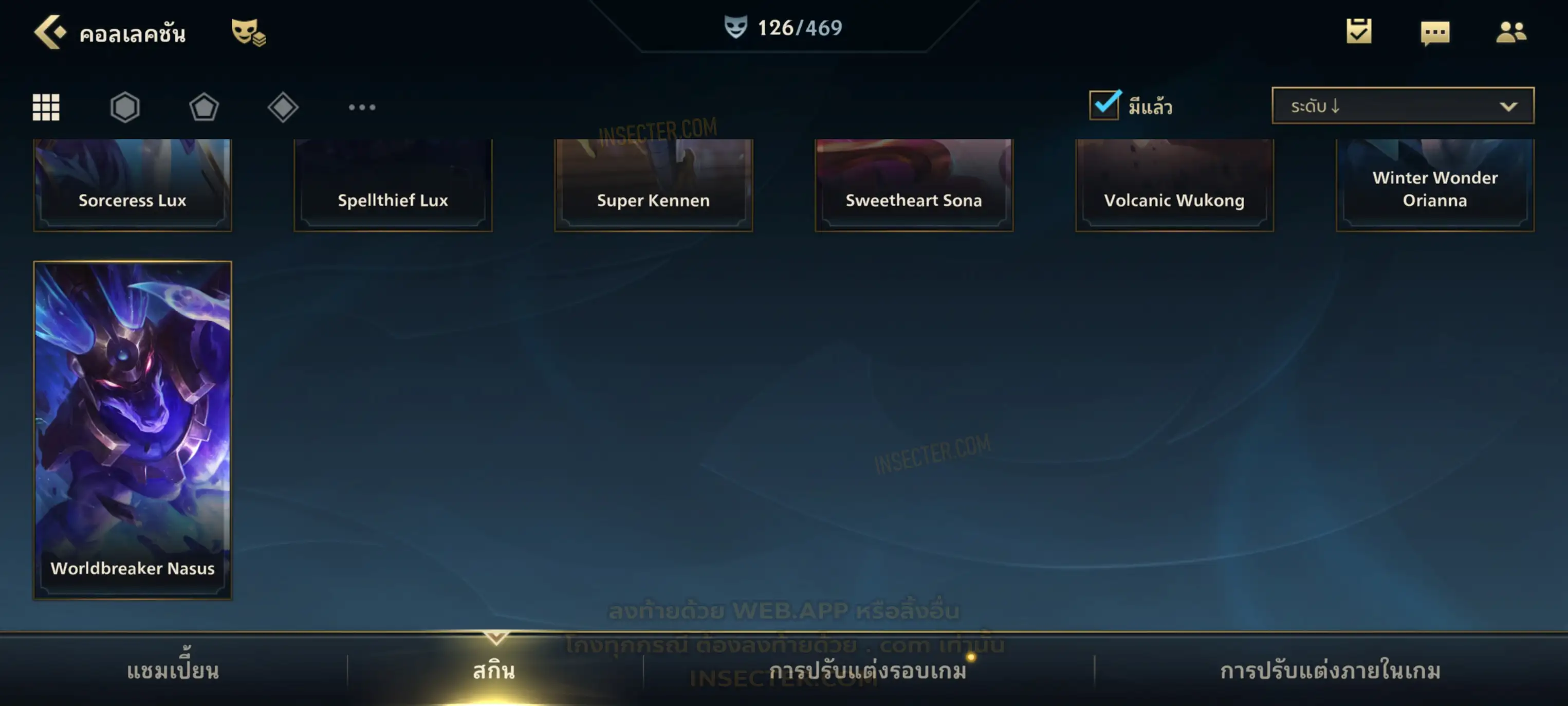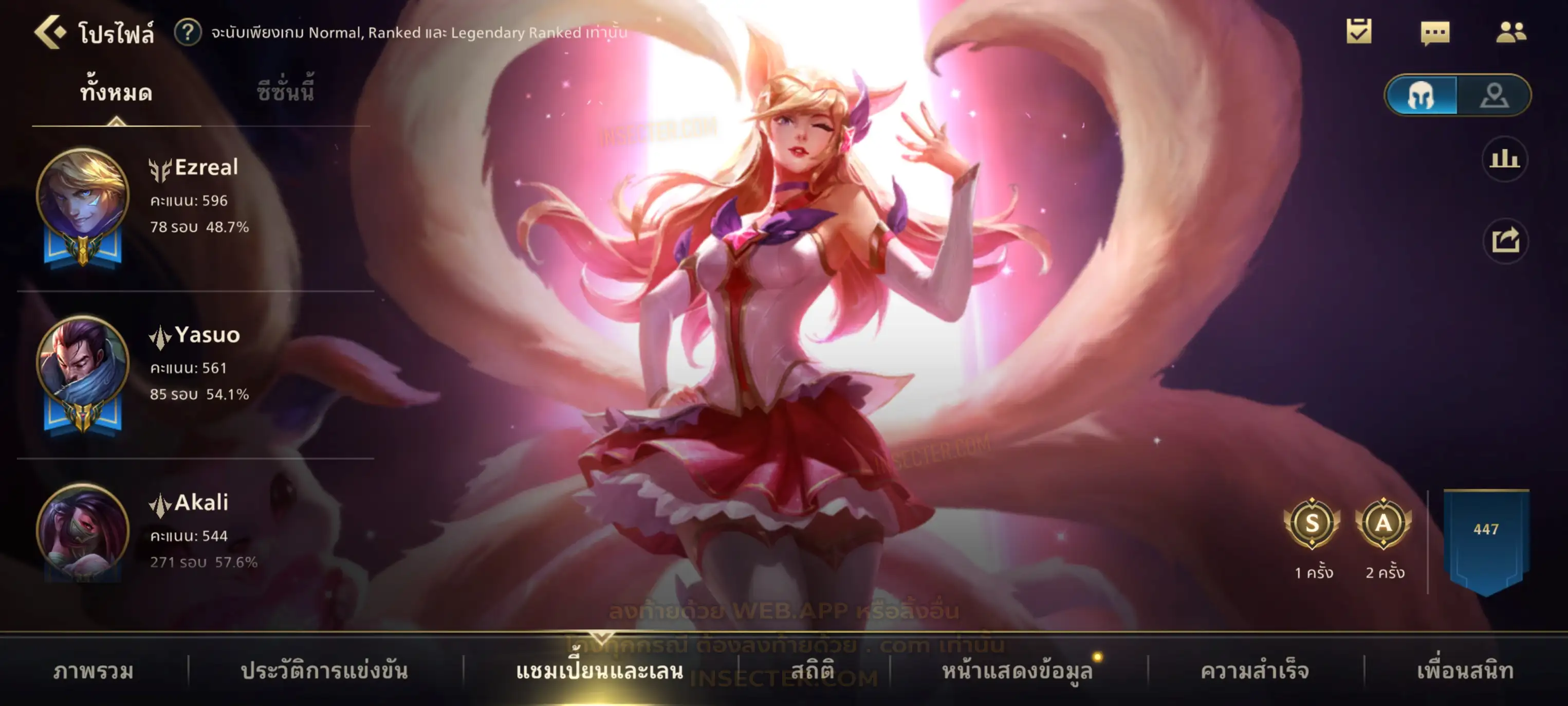 ข้อมูลย่อ : เมน MID-AD-TOP แชมครบของตกแต่งเยอะมีลิมิเต็ด 5 สกินคุ้ม ๆ จ้า ราคา 2,700 บาท 106/106 >แชมเปี้ยน 126 >สกิน 20 >Legendary (กรอบลิมิเต็ด 3 กรอบ) 69 >Epic (กรอบลิมิเต็ด 3 กรอบ+ท่าโพสพิเศษ 3 ท่า) 37 >อื่นๆ (กรอบลิมิเต็ด 6 กรอบ + ท่าโพสพิเศษ 2 ท่า)