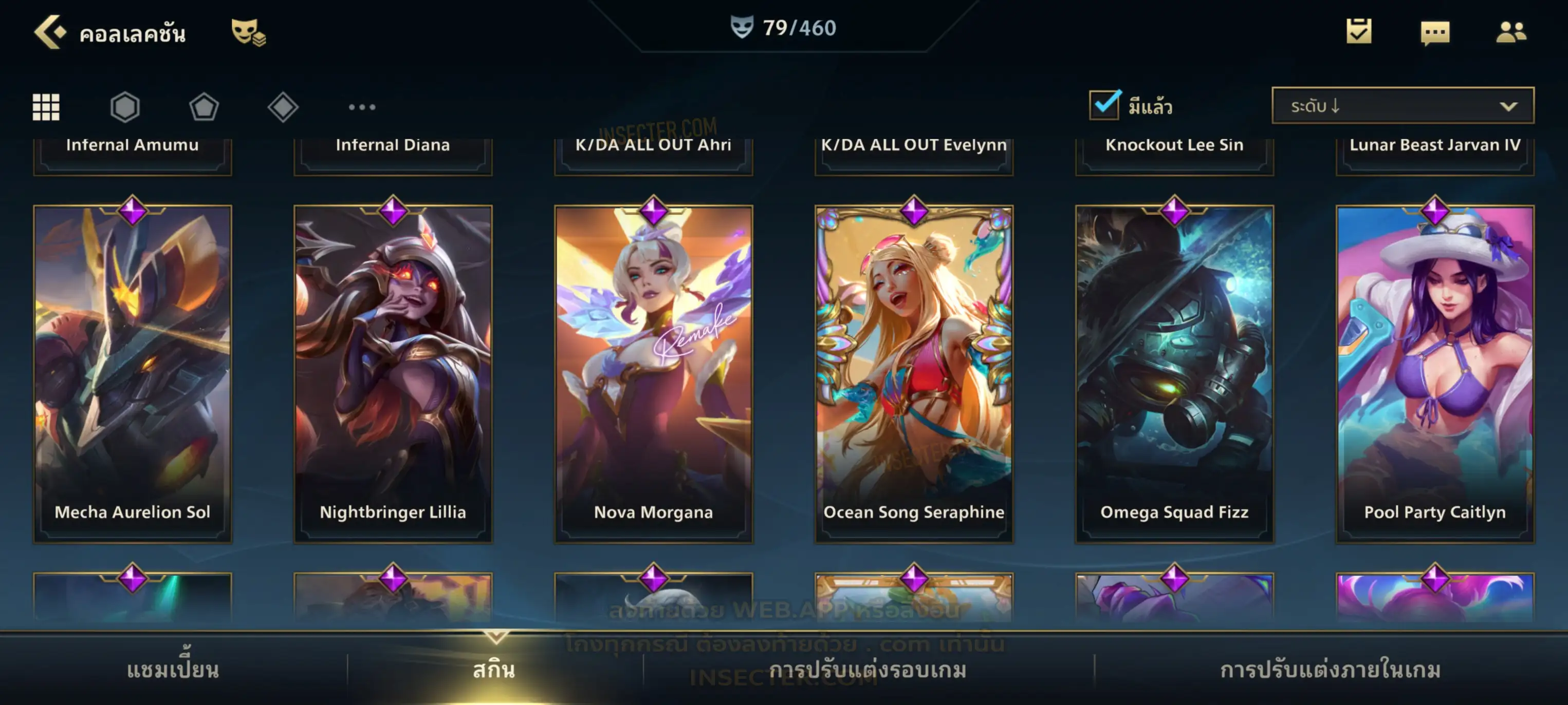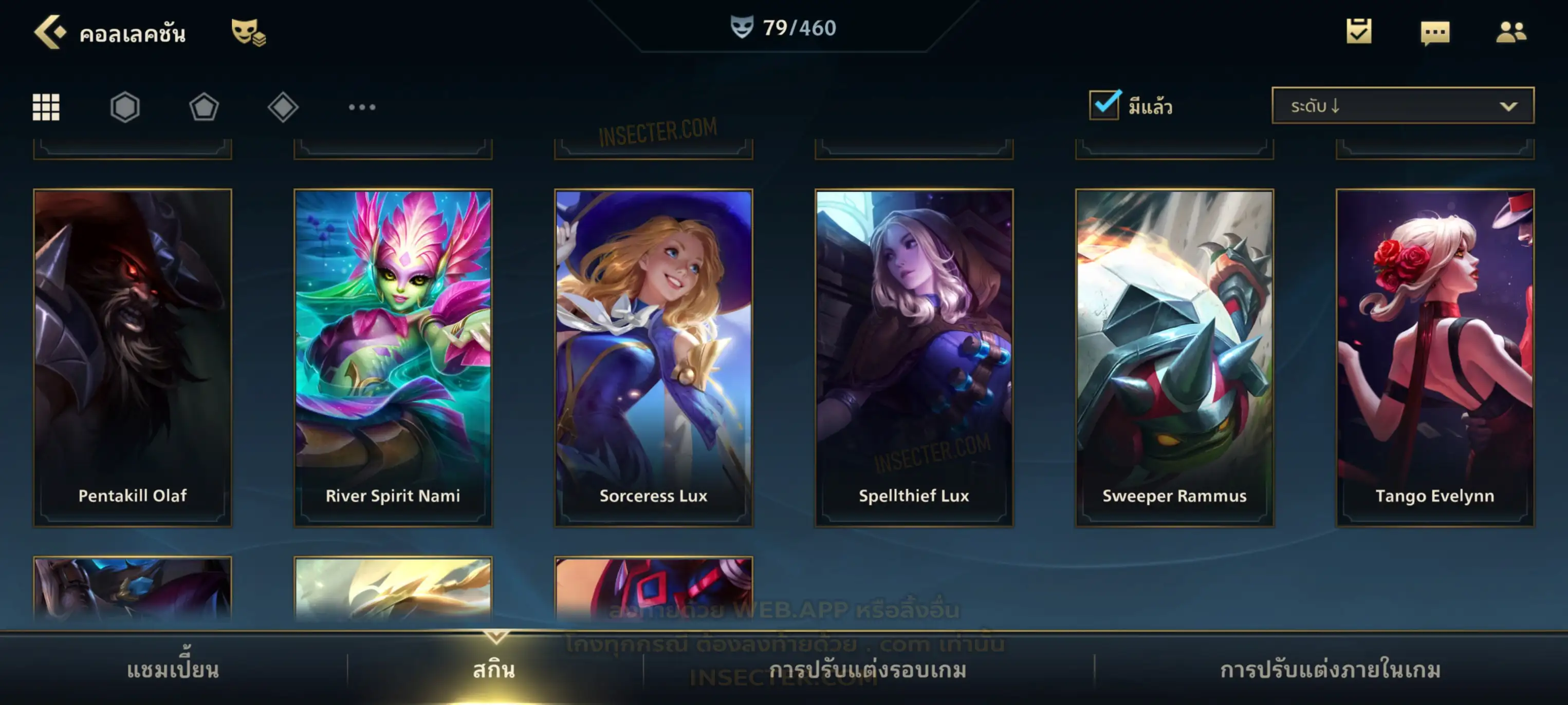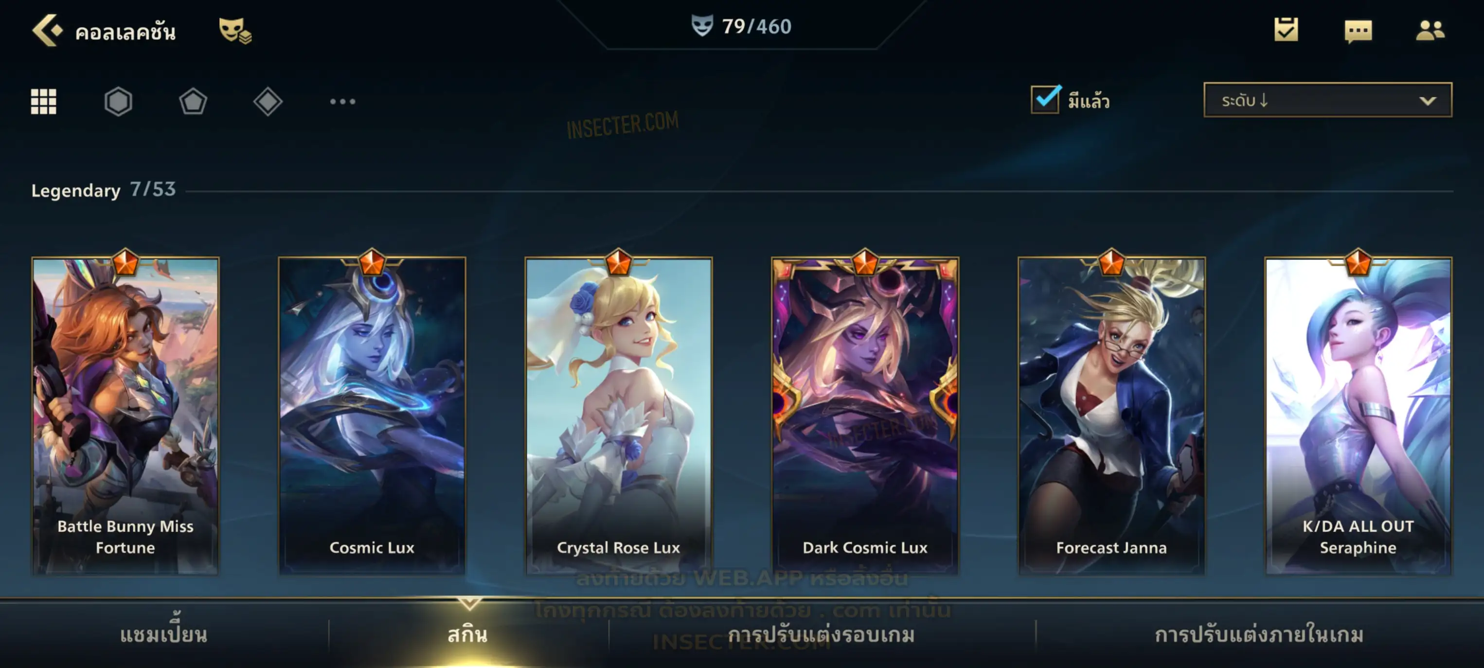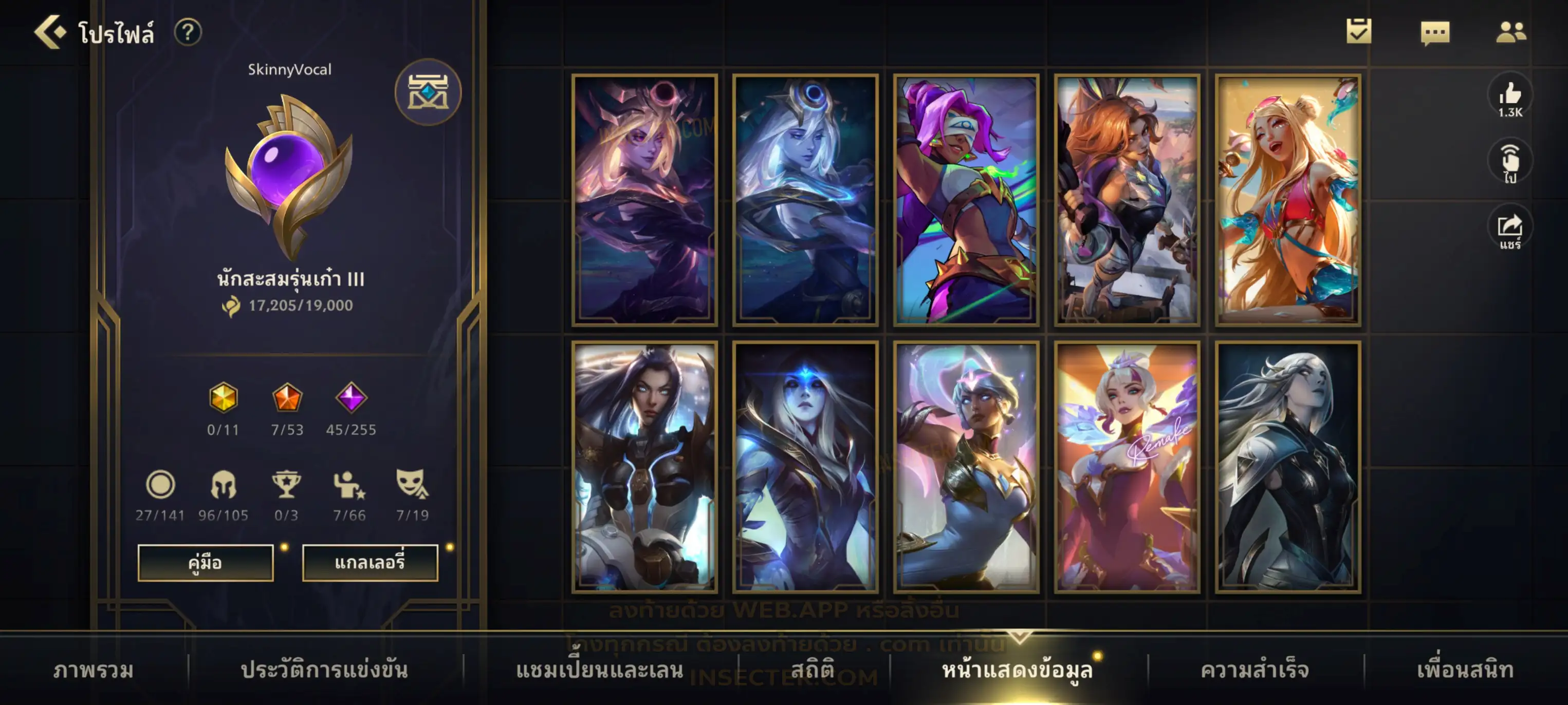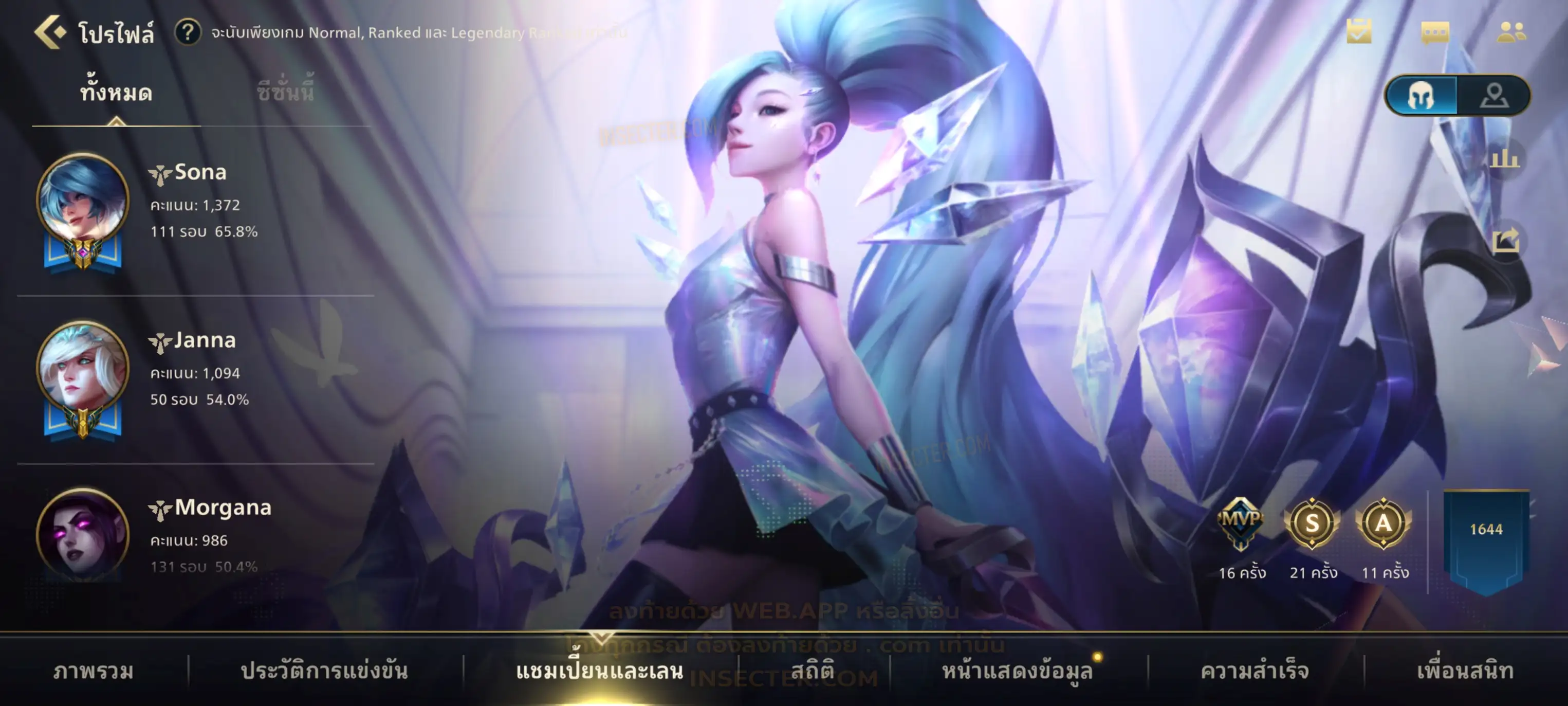 ข้อมูลย่อ : เมน MID-SUP-AD แชมเยอะ เน้นสกินผู้หญิงสวย ๆ คุ้ม ๆ เลยจ้า 96/105 >แชมเปี้ยน 79 >สกิน 7 >Legendary (กรอบลิมิเต็ด 2 กรอบ+ท่าโพสพิเศษ 2 ท่า '' เป็นแบบกดในเกมได้ 1ท่า '') 45 >Epic (กรอบลิมิเต็ด 6 กรอบ+ท่าโพสพิเศษ 3 ท่า) 27 >อื่นๆ (กรอบลิมิเต็ด 7 กรอบ+ท่าโพสพิเศษ 2 ท่า)