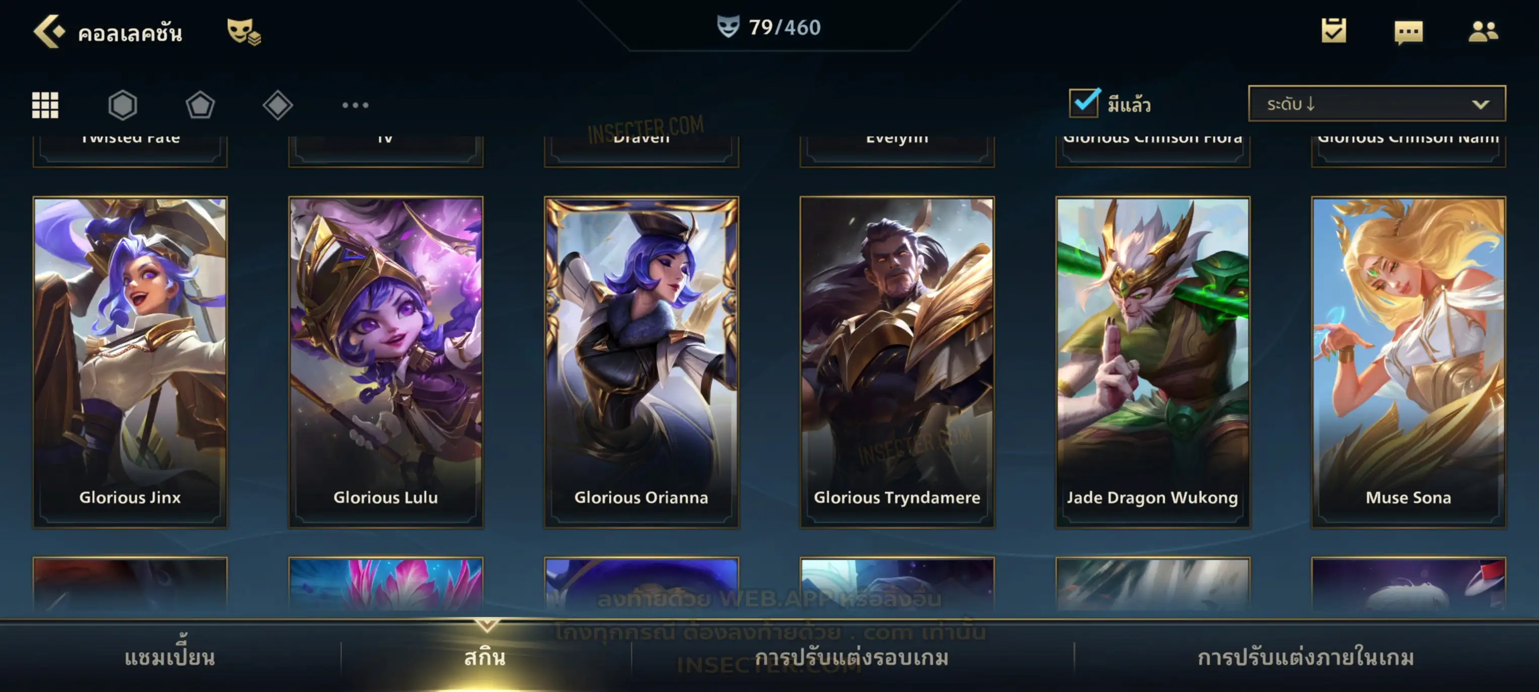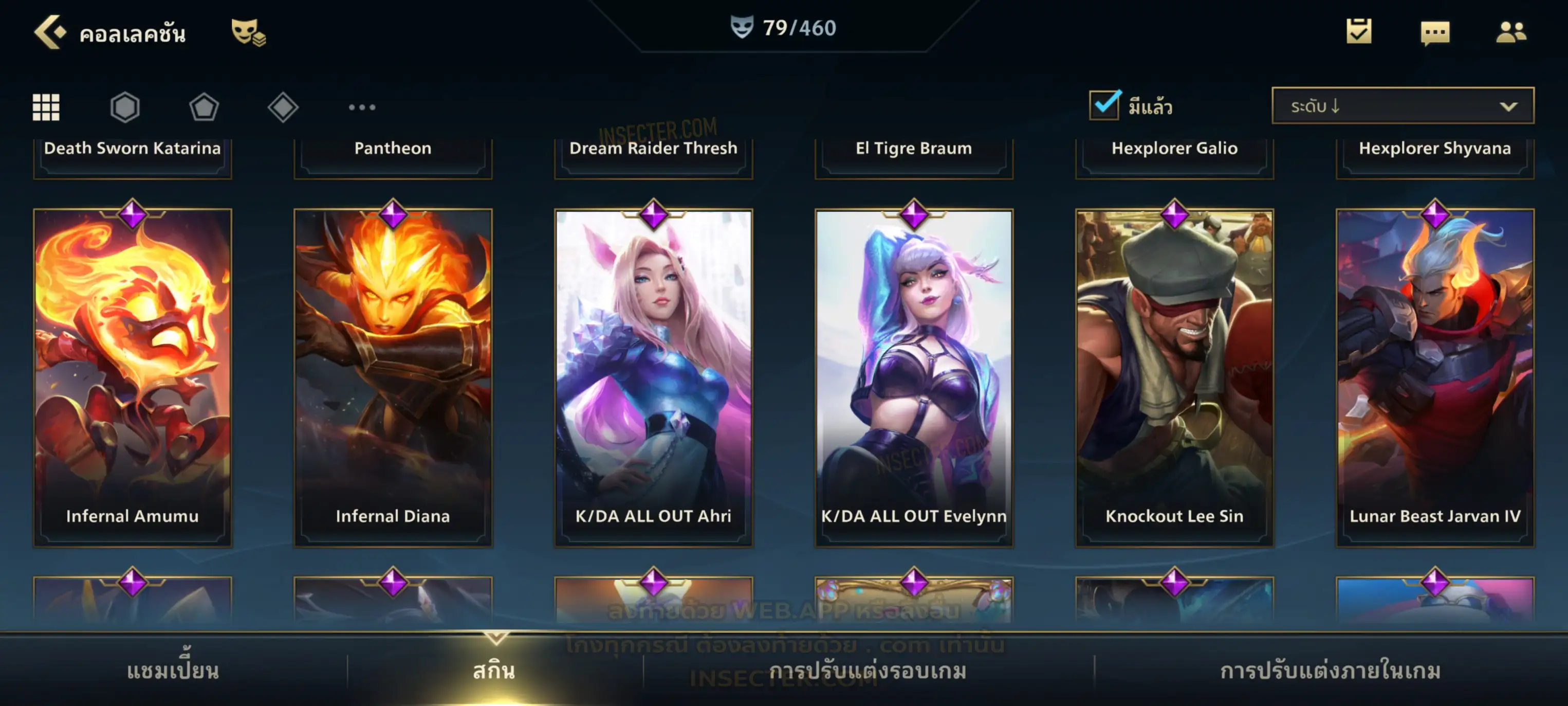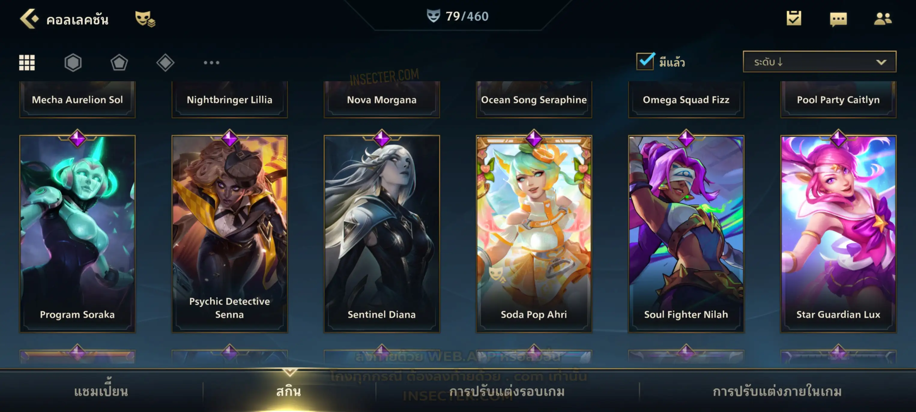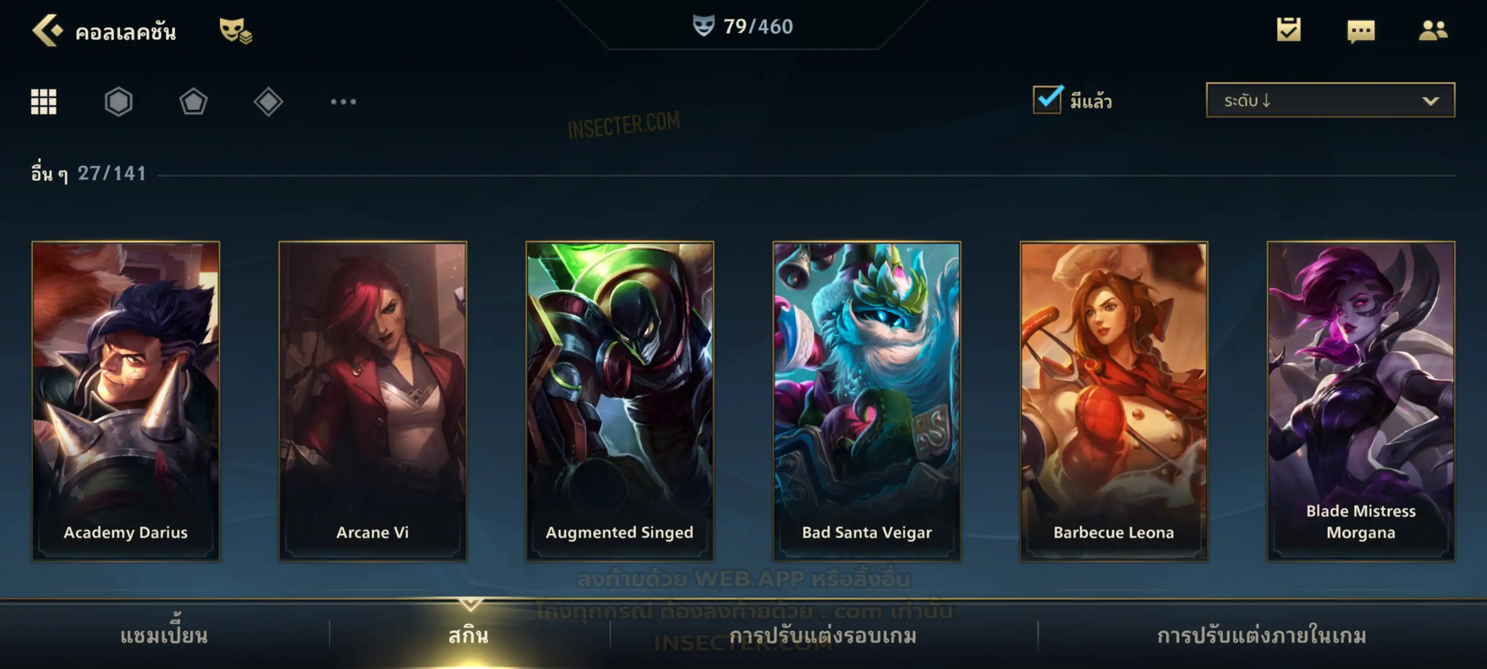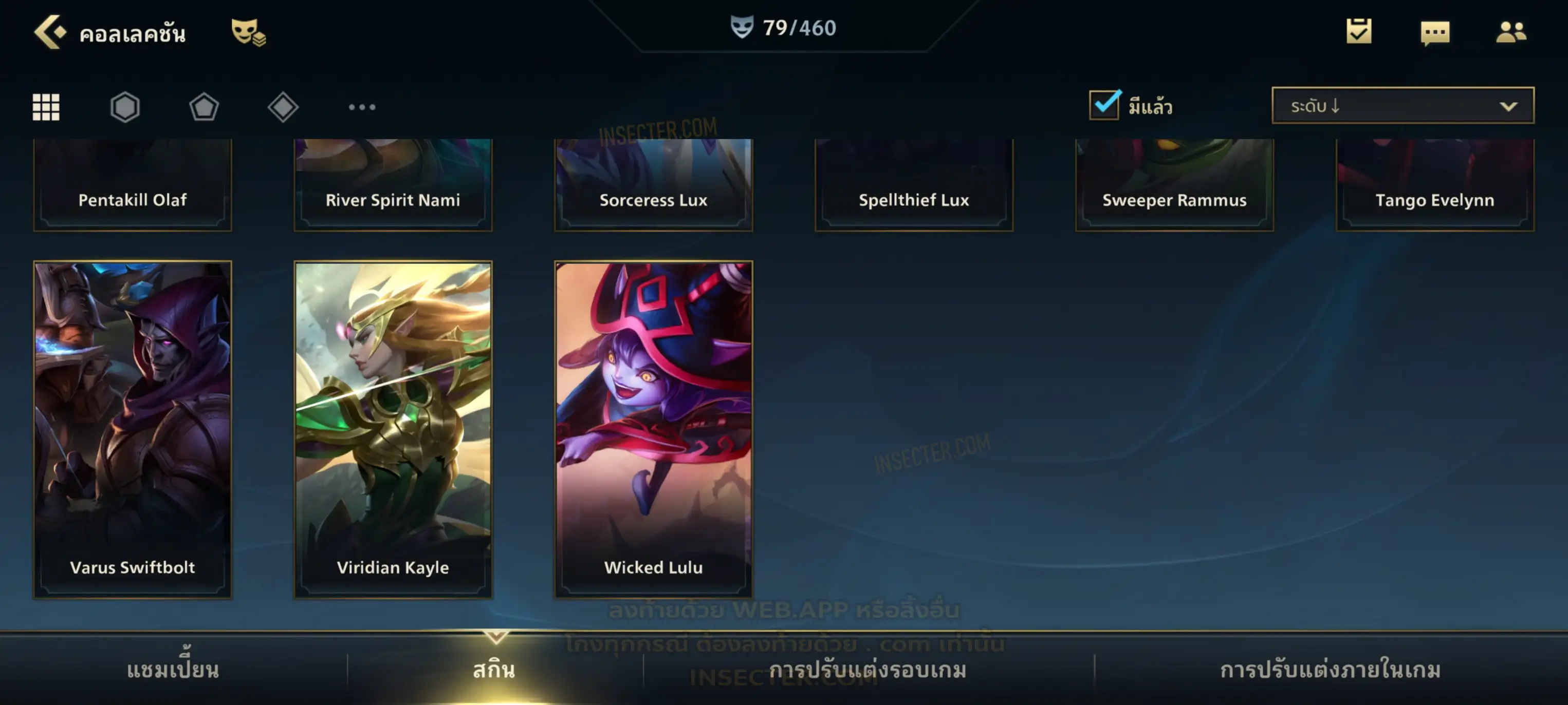 ข้อมูลย่อ : เมน MID-SUP-AD แชมเยอะ เน้นสกินผู้หญิงสวย ๆ คุ้ม ๆ เลยจ้า 96/105 >แชมเปี้ยน 79 >สกิน 7 >Legendary (กรอบลิมิเต็ด 2 กรอบ+ท่าโพสพิเศษ 2 ท่า '' เป็นแบบกดในเกมได้ 1ท่า '') 45 >Epic (กรอบลิมิเต็ด 6 กรอบ+ท่าโพสพิเศษ 3 ท่า) 27 >อื่นๆ (กรอบลิมิเต็ด 7 กรอบ+ท่าโพสพิเศษ 2 ท่า)