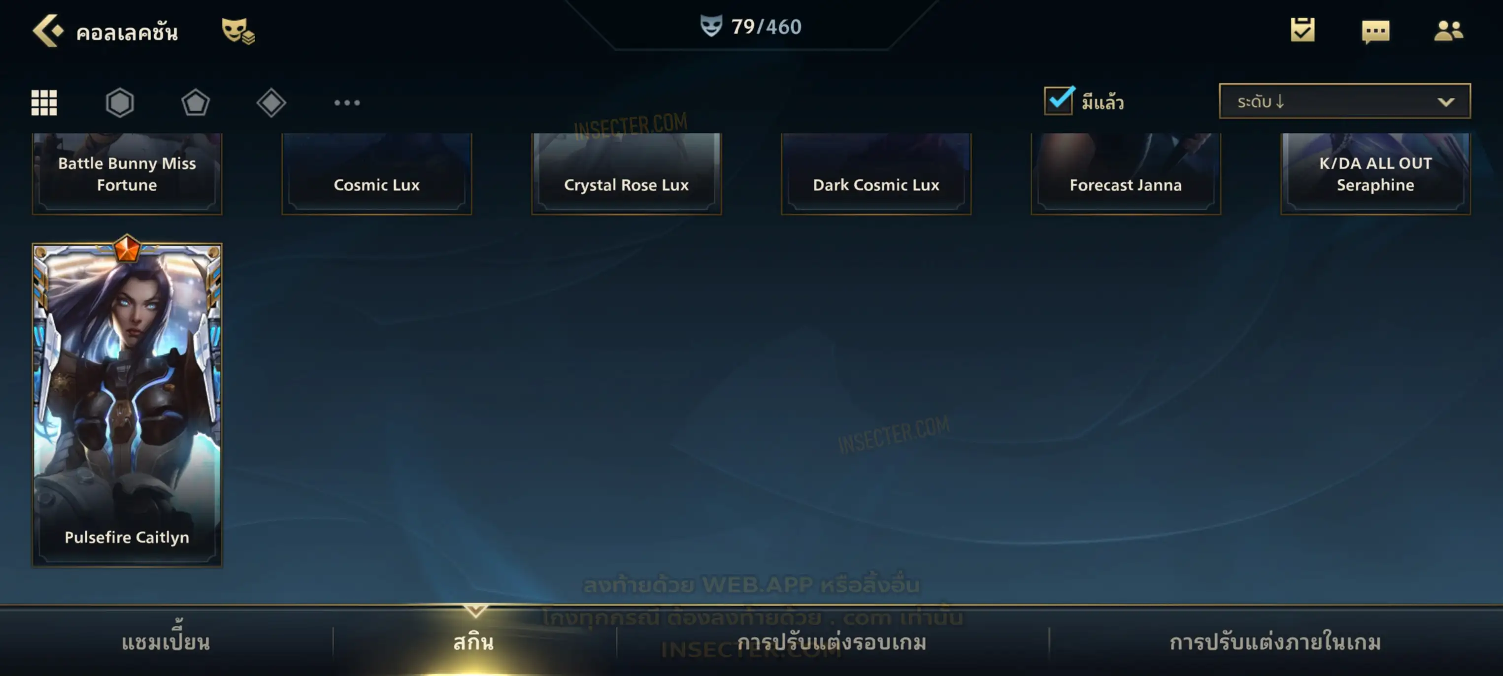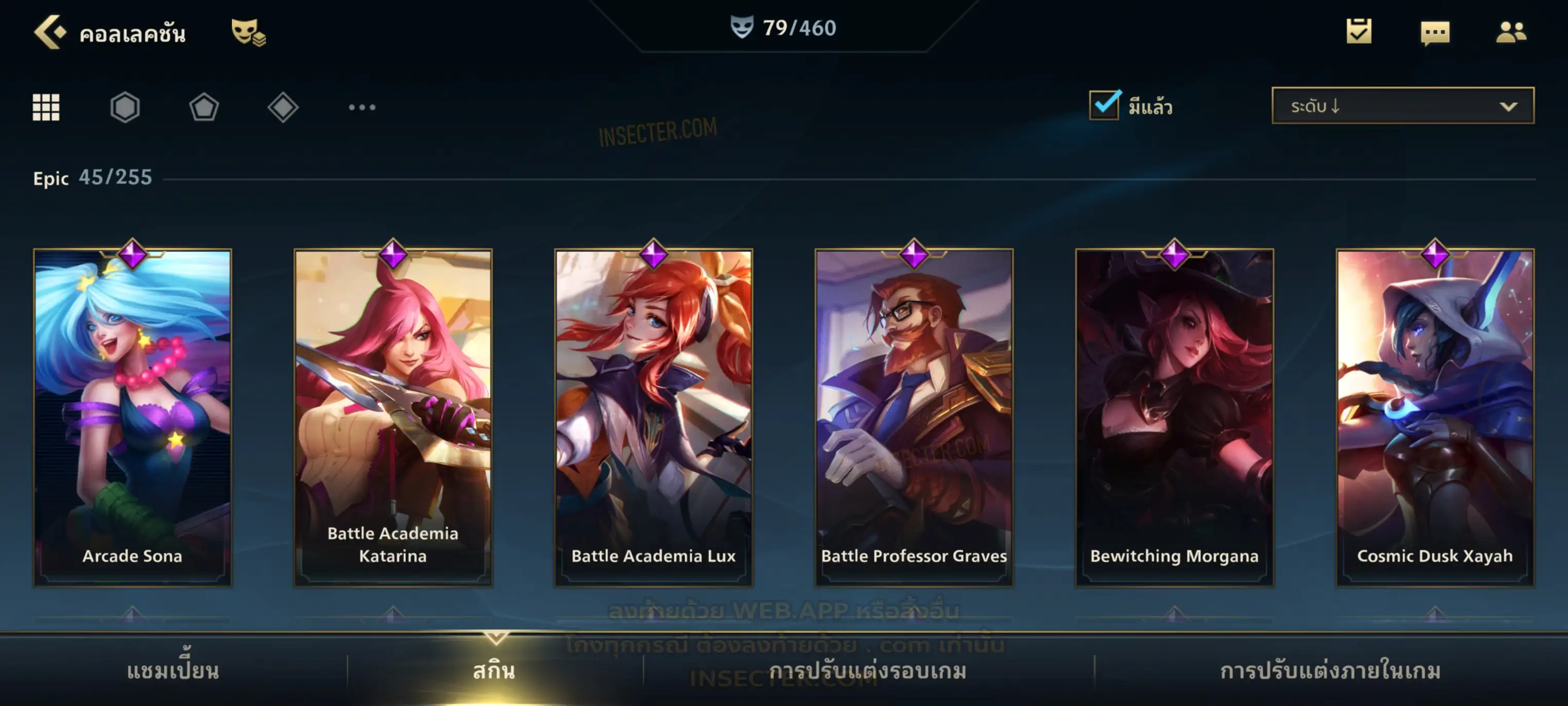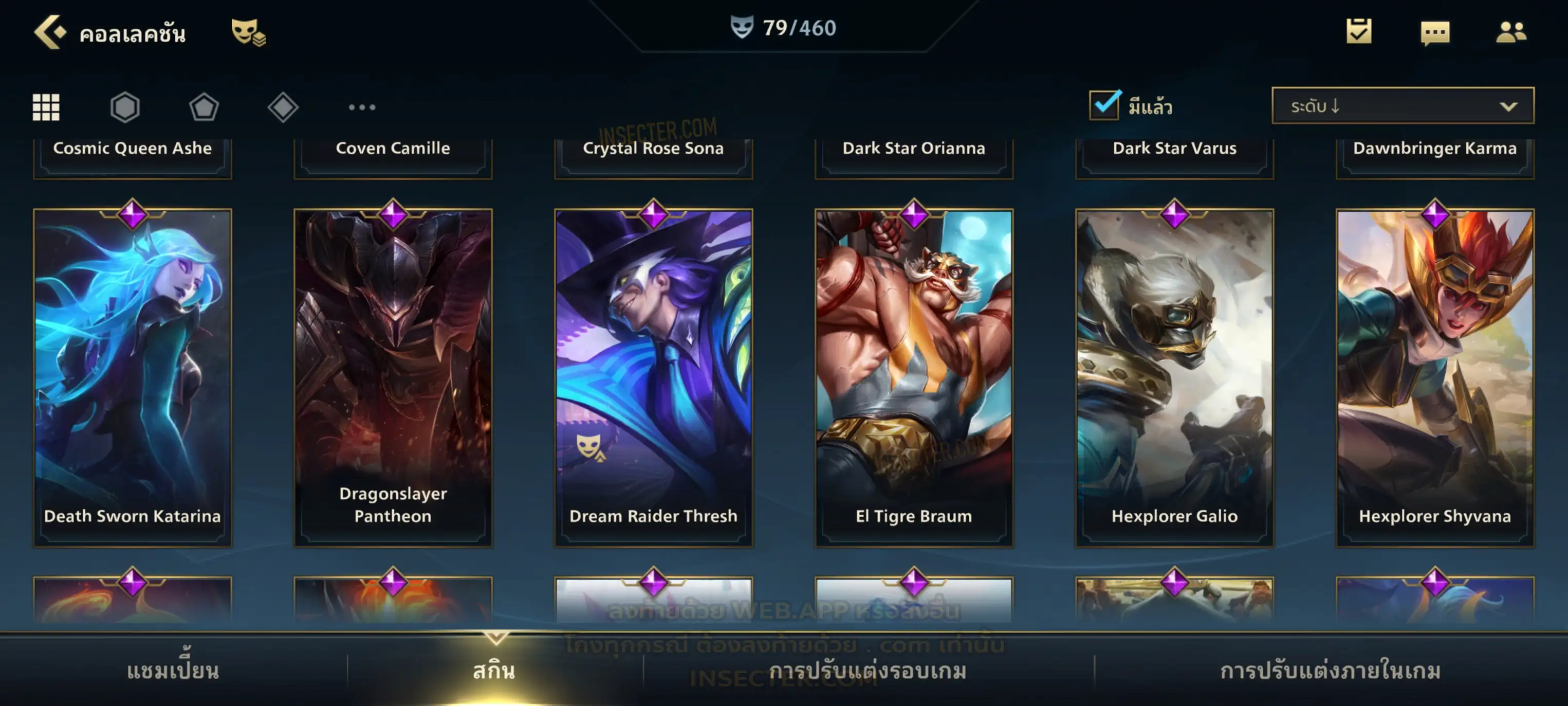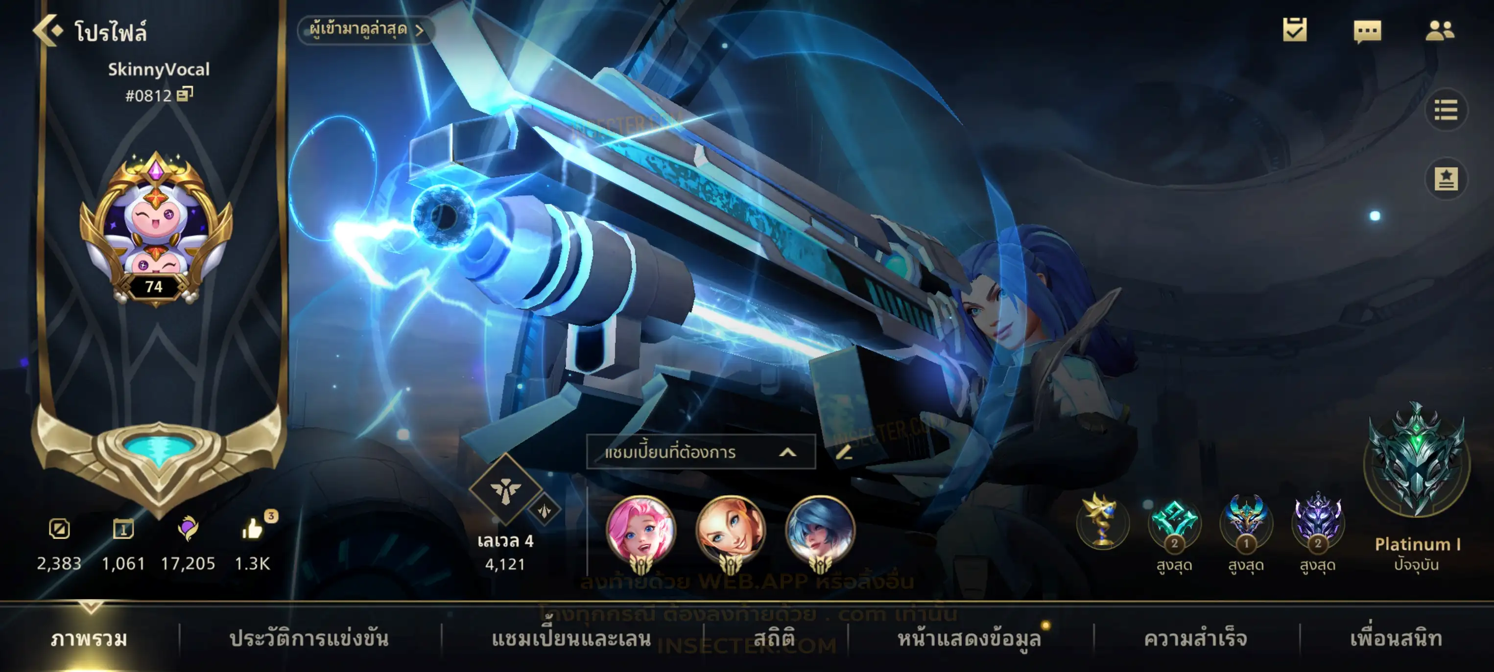 ข้อมูลย่อ : เมน MID-SUP-AD แชมเยอะ เน้นสกินผู้หญิงสวย ๆ คุ้ม ๆ เลยจ้า 96/105 >แชมเปี้ยน 79 >สกิน 7 >Legendary (กรอบลิมิเต็ด 2 กรอบ+ท่าโพสพิเศษ 2 ท่า '' เป็นแบบกดในเกมได้ 1ท่า '') 45 >Epic (กรอบลิมิเต็ด 6 กรอบ+ท่าโพสพิเศษ 3 ท่า) 27 >อื่นๆ (กรอบลิมิเต็ด 7 กรอบ+ท่าโพสพิเศษ 2 ท่า)
