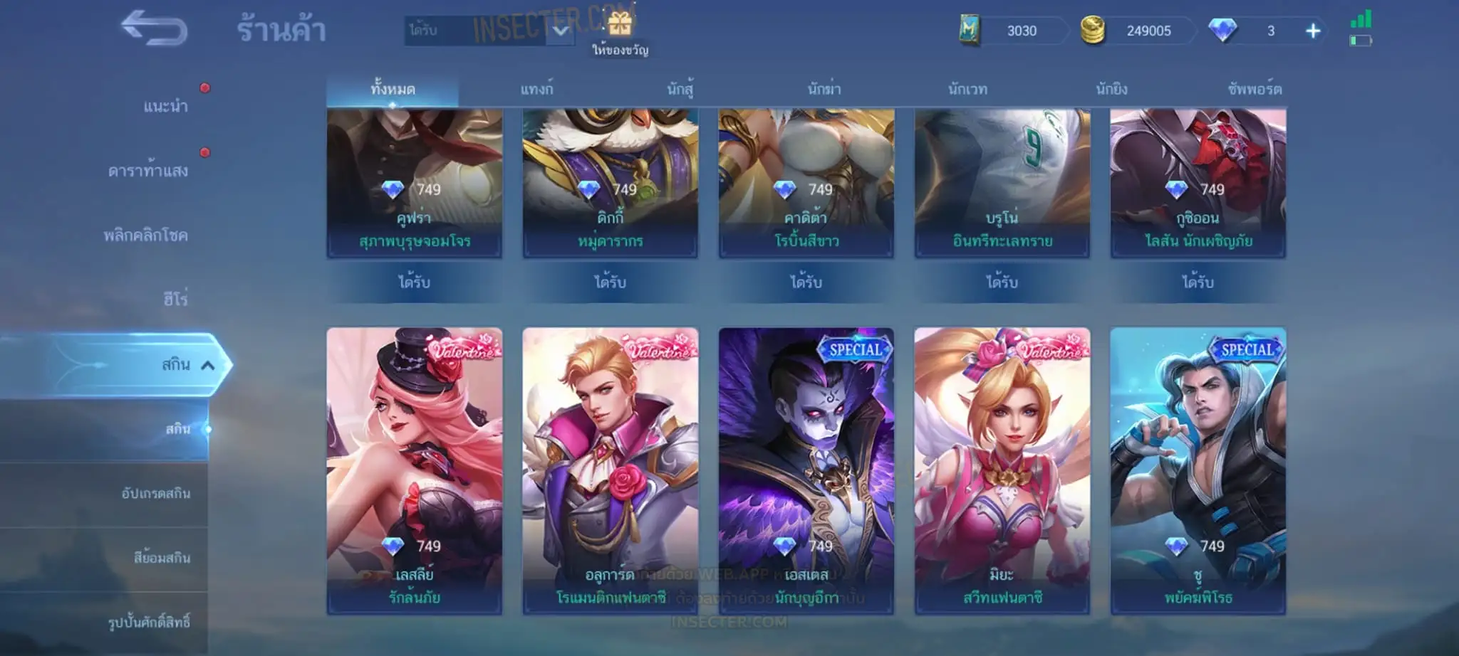 ข้อมูลย่อ : Hero 122 Skin 508 เอ็มเบลตัน/วาร์ปแรร์ มงกุฎไฟ Epic ถาวร และอื่นๆ !!! ตั๋ว 3,000 ทอง 249,000 Legend 5 ตัว Collector 4 ตัว อนิเมะ 20 ตัว Zodiac 13 ตัว (ครบ) !!! Epic ธรรมดา/แรร์ 30 ตัว Special ธรรมดา/แรร์ 48 ตัว Ster/Champion/MSC/Luner/Christmas/Valentine/Halloween/515/AS/MDI/Create/ Limited 42 ตัว ถ่ายมาบางส่วนยังไม่รวม Elite/Season/Ster คอลเลคชั่นอื่นๆ