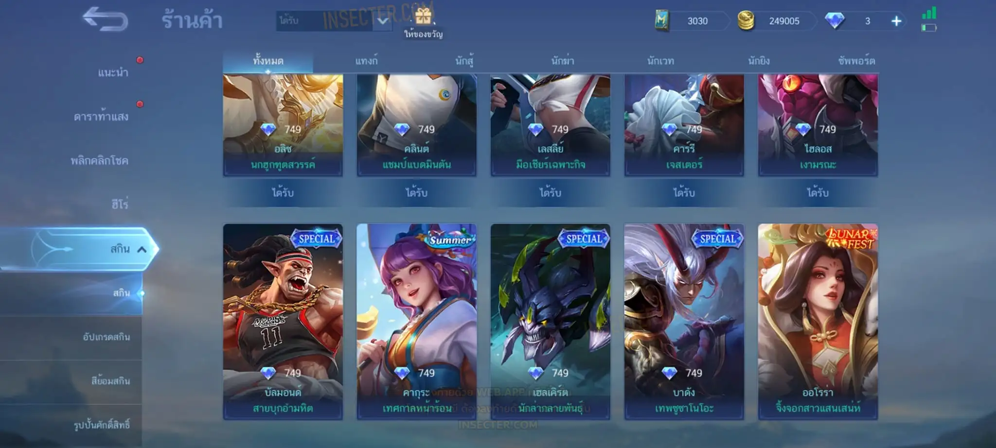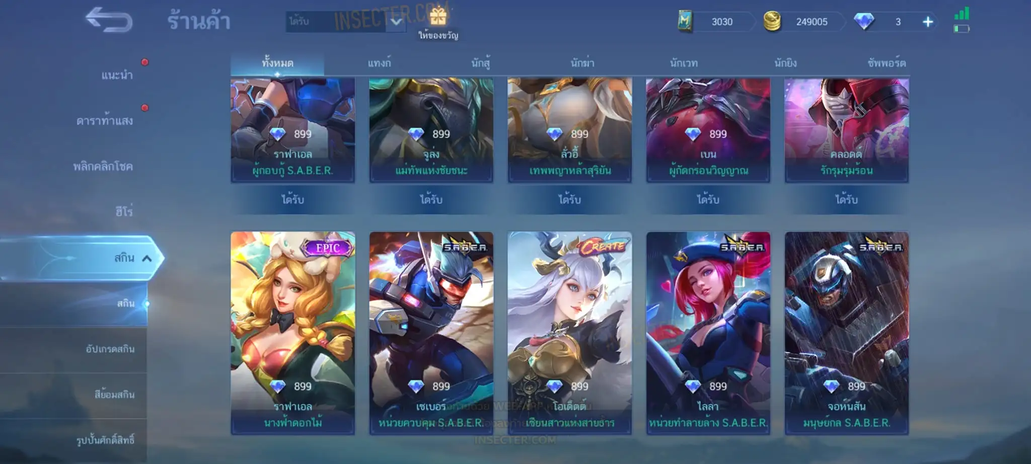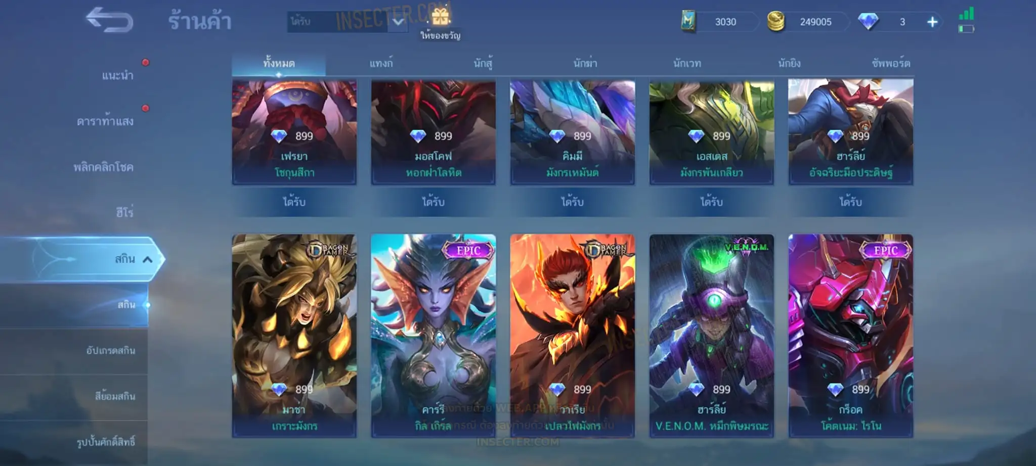 ข้อมูลย่อ : Hero 122 Skin 508 เอ็มเบลตัน/วาร์ปแรร์ มงกุฎไฟ Epic ถาวร และอื่นๆ !!! ตั๋ว 3,000 ทอง 249,000 Legend 5 ตัว Collector 4 ตัว อนิเมะ 20 ตัว Zodiac 13 ตัว (ครบ) !!! Epic ธรรมดา/แรร์ 30 ตัว Special ธรรมดา/แรร์ 48 ตัว Ster/Champion/MSC/Luner/Christmas/Valentine/Halloween/515/AS/MDI/Create/ Limited 42 ตัว ถ่ายมาบางส่วนยังไม่รวม Elite/Season/Ster คอลเลคชั่นอื่นๆ