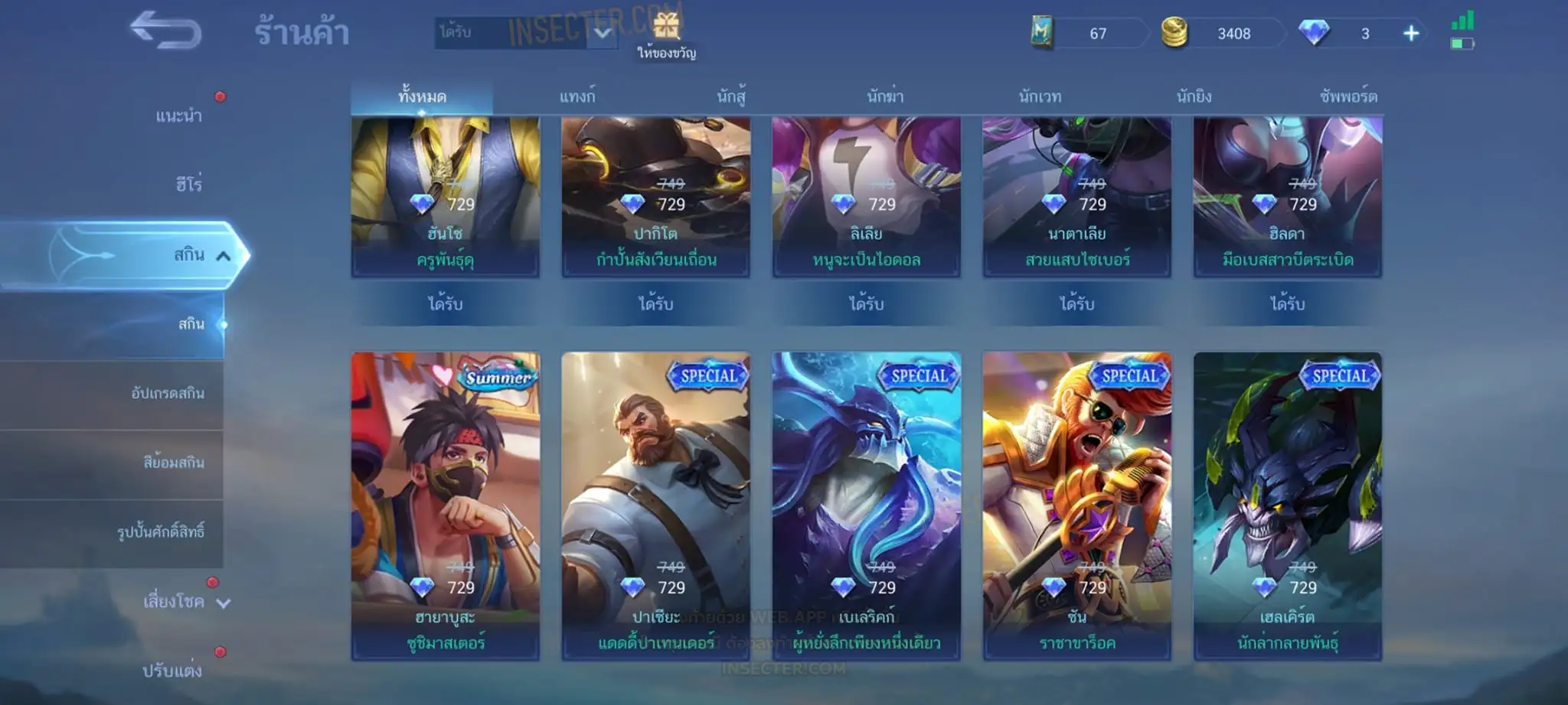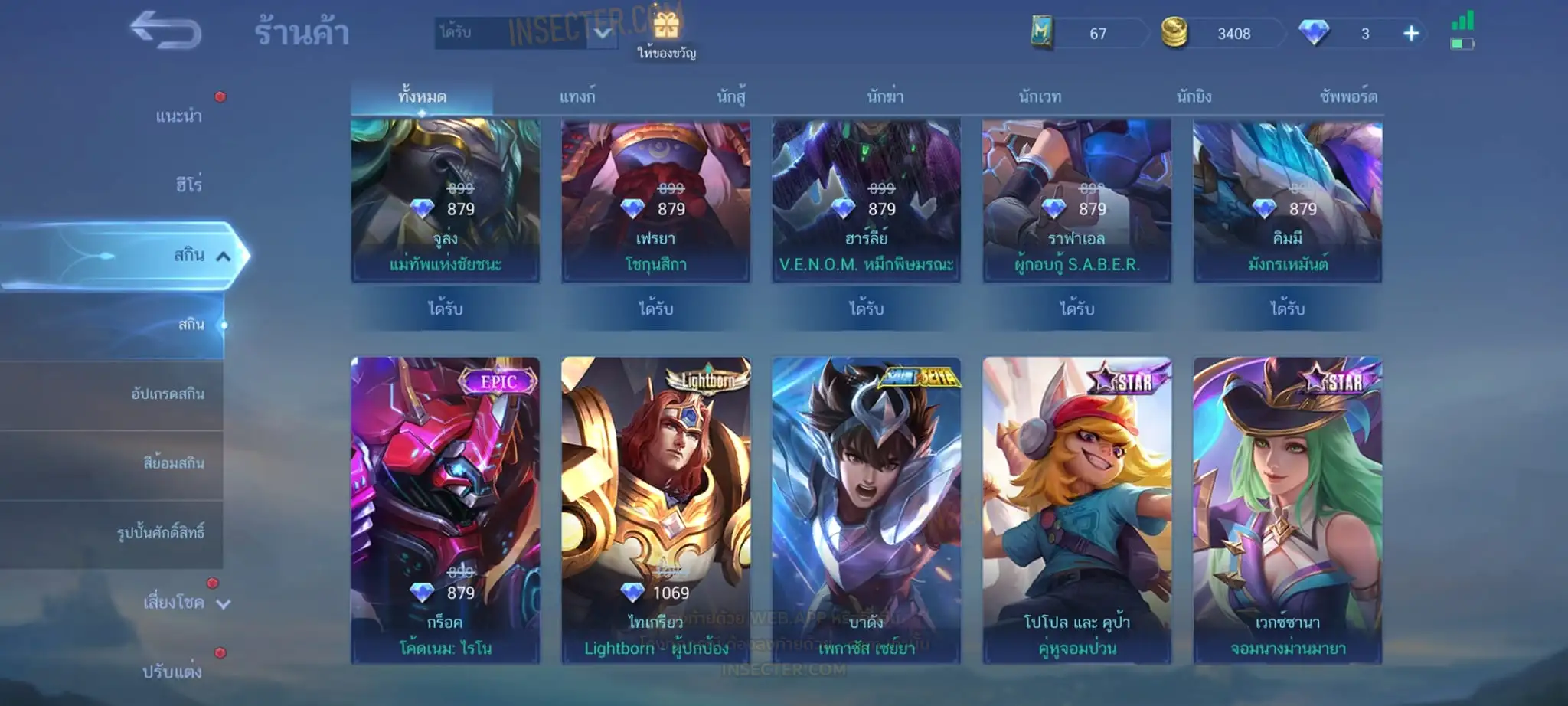 ข้อมูลย่อ : Hero 39 Skin 108 เอ็มเบลสายเวทย์ตัน/วาร์ปปีกพิพากษา แสงดาว ปี 2022 แก่นพลังเวท 80 (ครบ 200 แลก Skin Legend 1 ตัว) 1.เบเนเด็ตตา Collector 2.รูบี้ อนิเมะ 3.แองเจลา อนิเมะ ถ่ายมาบางส่วนยังไม่รวม Skin Special/Elite/Season/Ster คอลเลคชั่นอื่นๆ