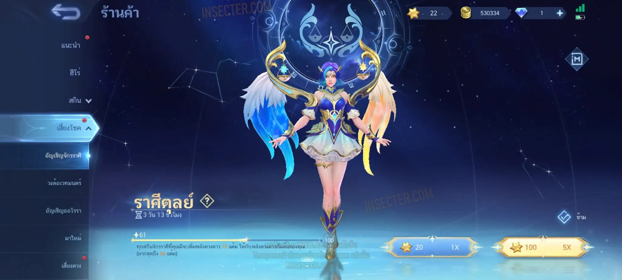 ข้อมูลย่อ : Hero 122 Skin 406 เอ็มเบลตัน/กรอบรูป Zodiac !!! วาร์ปแรร์ผนึกเวทย์สายฟ้า Epic ถาวร !!! วาร์ปแรร์ดอกผนึกนิรันดร์ Epic ถาวร !!! ตั๋ว 16,000 ทอง 530,000 แต้มราศี 61 (ครบ 100 แลก Skin Zodiac 1 ตัว) แก่นพลังเวท 114 (ครบ 200 แลก Skin Legend 1 ตัว) Legend 2 ตัว Collector 1 ตัว อนิเมะ 26 ตัว Zodiac 11/13 ตัว !!! M2/M3/M4/Prime 4 ตัว Epic แรร์/ธรรมดา 21 ตัว ถ่ายมาบางส่วนยังไม่รวม Special/Ster/MSC/Christmas/Valentine/Halloween/AS/515/Create/Season คอลเลคชั่นอื่นๆ